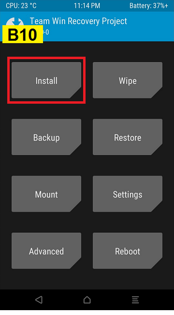 Bước 4: Máy điện thoại sẽ khởi động vào chế độ Recovery - TWRP như hình :