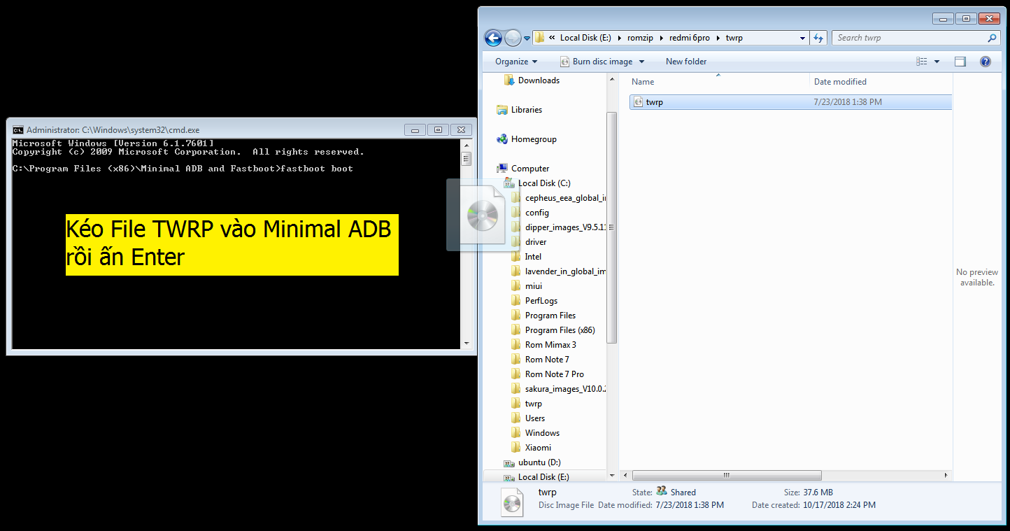 Kéo File TWRP thả vào Minimal ADB rồi ấn Enter