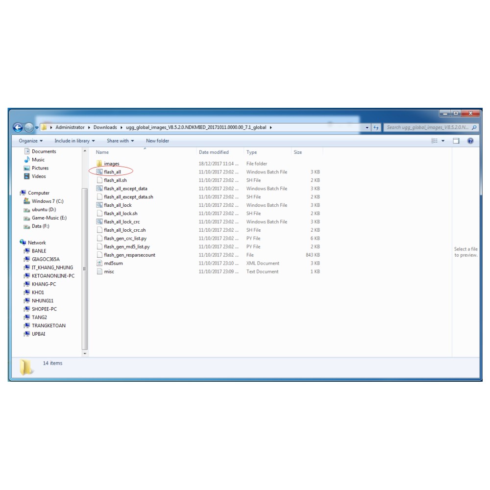 - khi đã vào fastboot ta kết nối điện thoại với máy vi tính và tìm đến nơi lưu file rom đã tải bên trên và chạy file "flash all" như hình